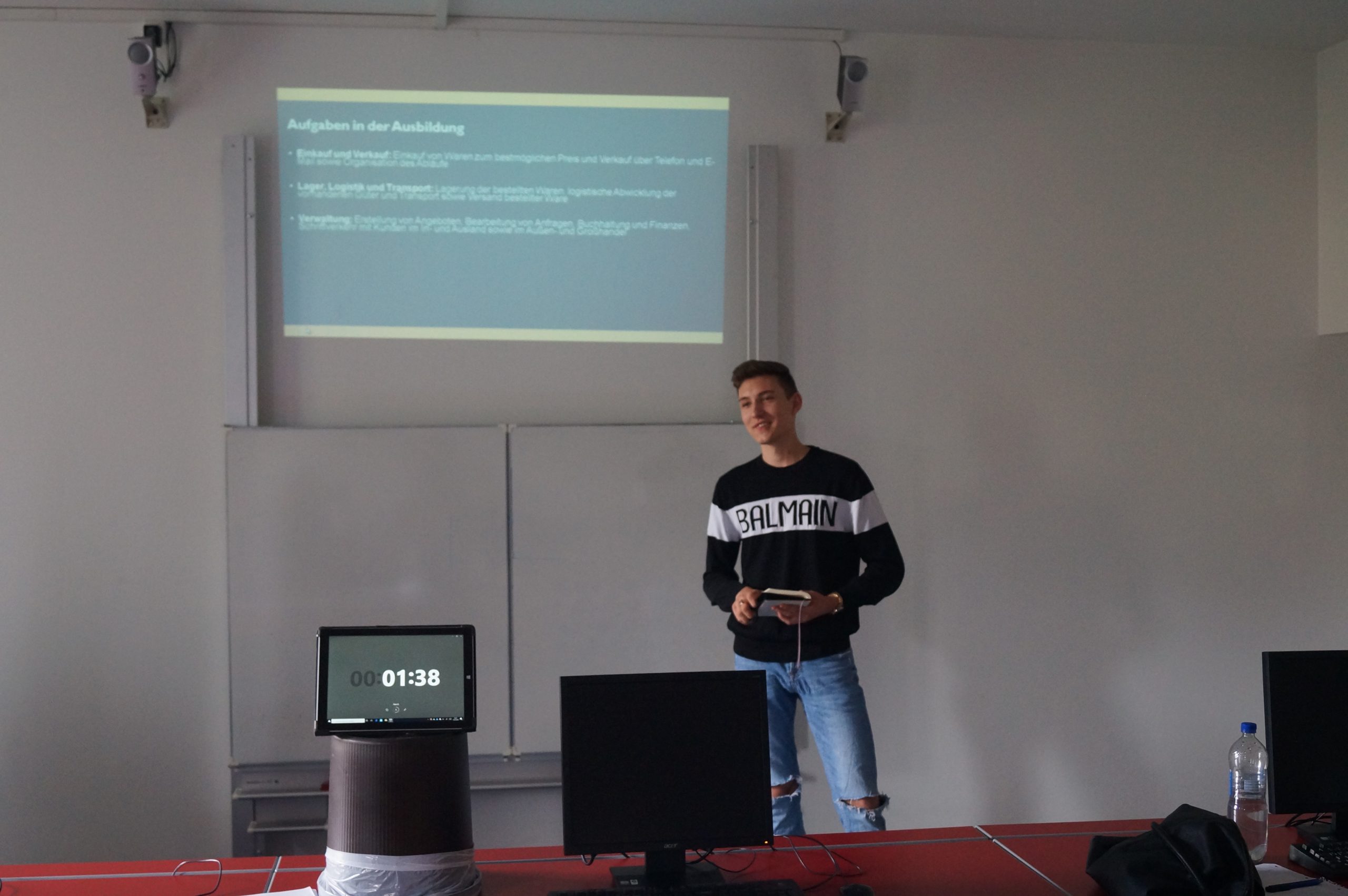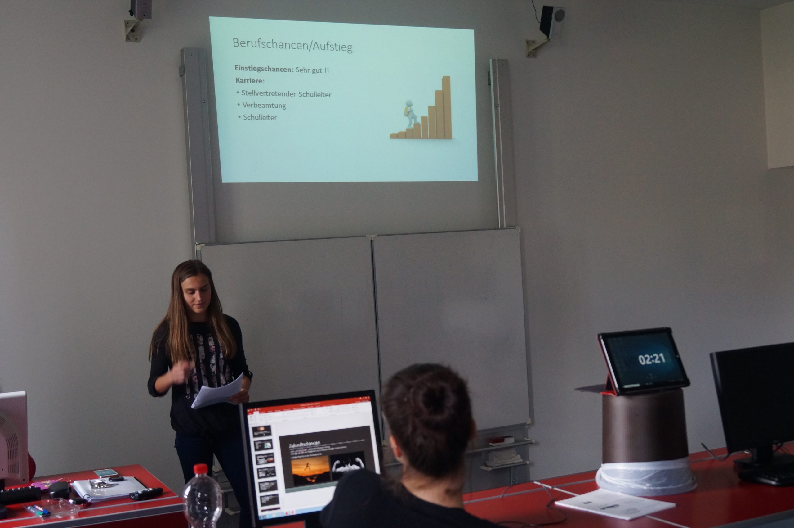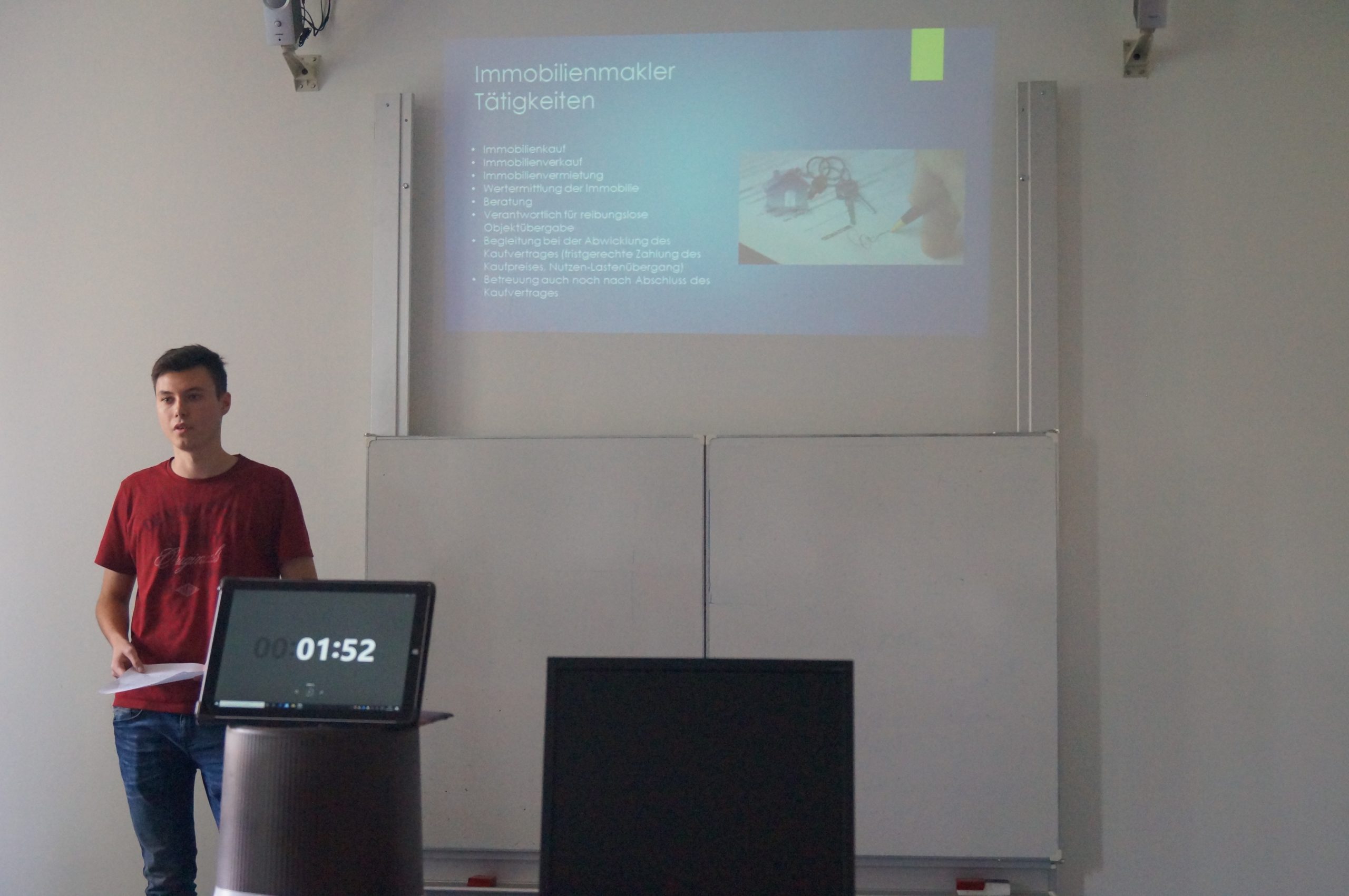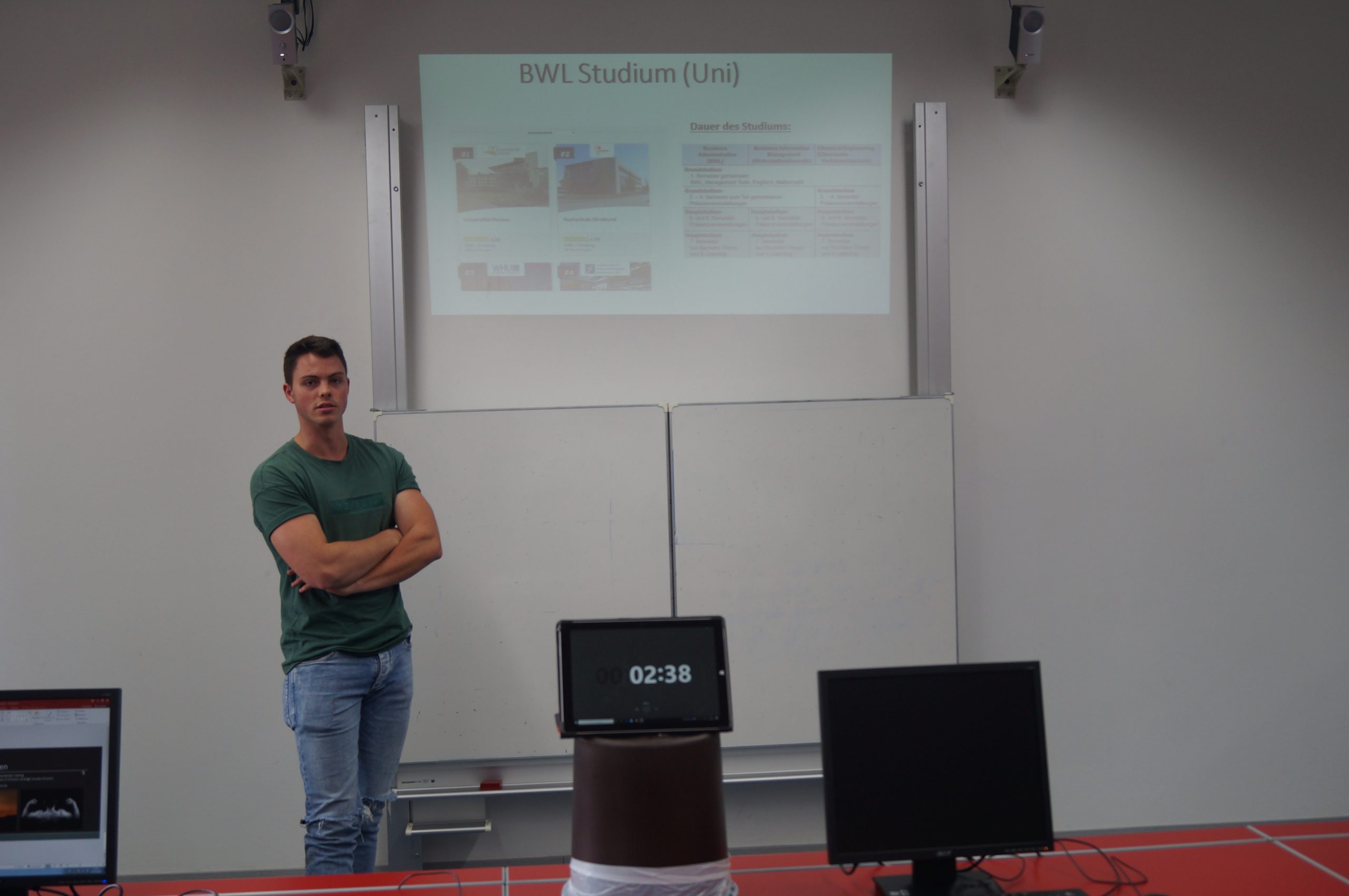 Dann begann der Pecha-Kucha-Vormittag: Jeder Schüler wurde über 13 andere Studiengänge und Ausbildungsberufe informiert. Wer seinen Vortrag gehalten hatte, steuerte am Lehrerrechner die Präsentation seines Nachfolgers, indem er alle 30 Sekunden zur nächsten Folie weitersprang – unabhängig davon, ob sie schon fertig besprochen war. In mehreren Fällen hätte man gerne mehr über das Thema erfahren, doch nach exakt 3 Minuten wurde der Vortragende durch den für ihn selbst nicht sichtbaren Timer unterbrochen.