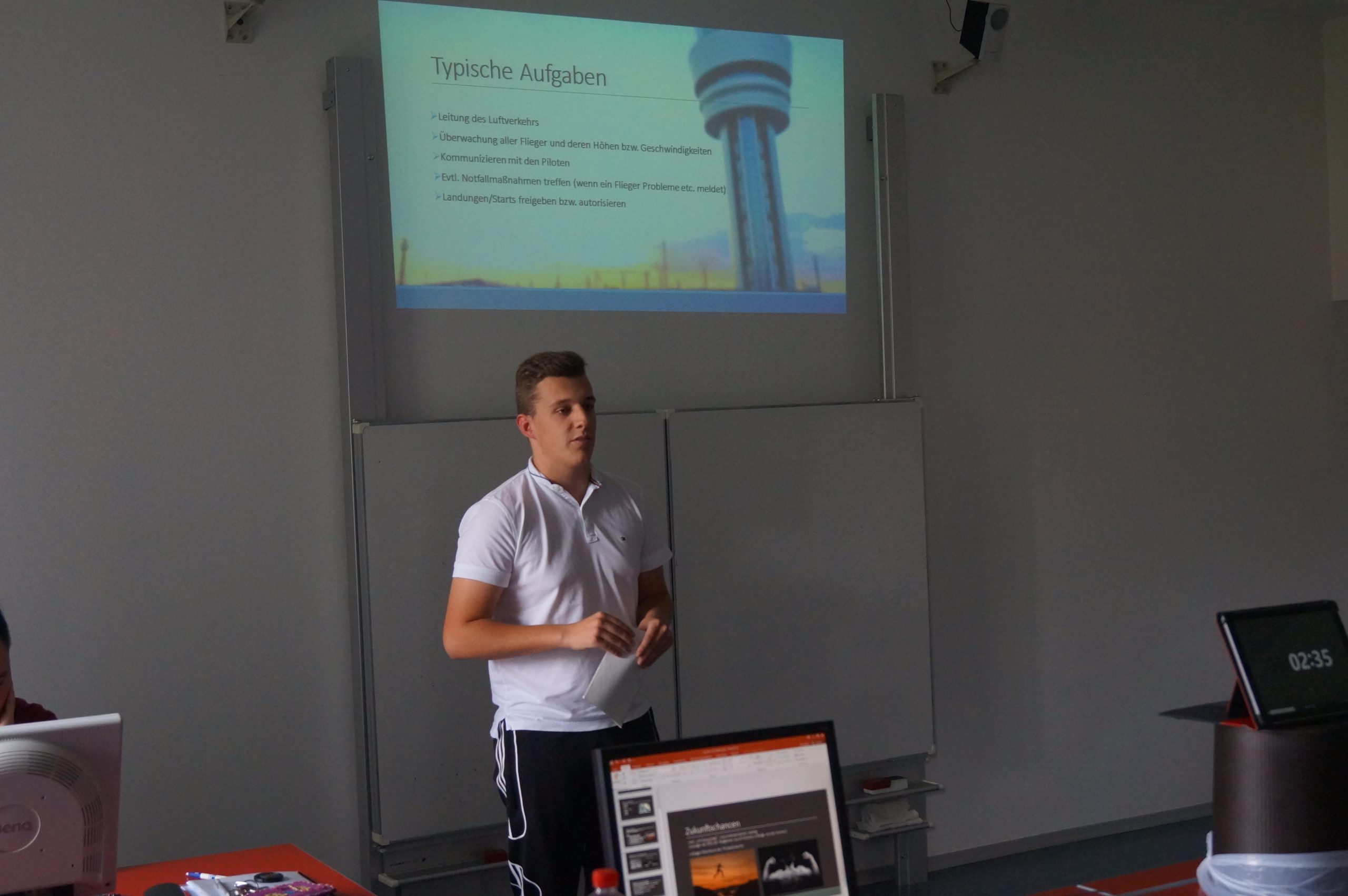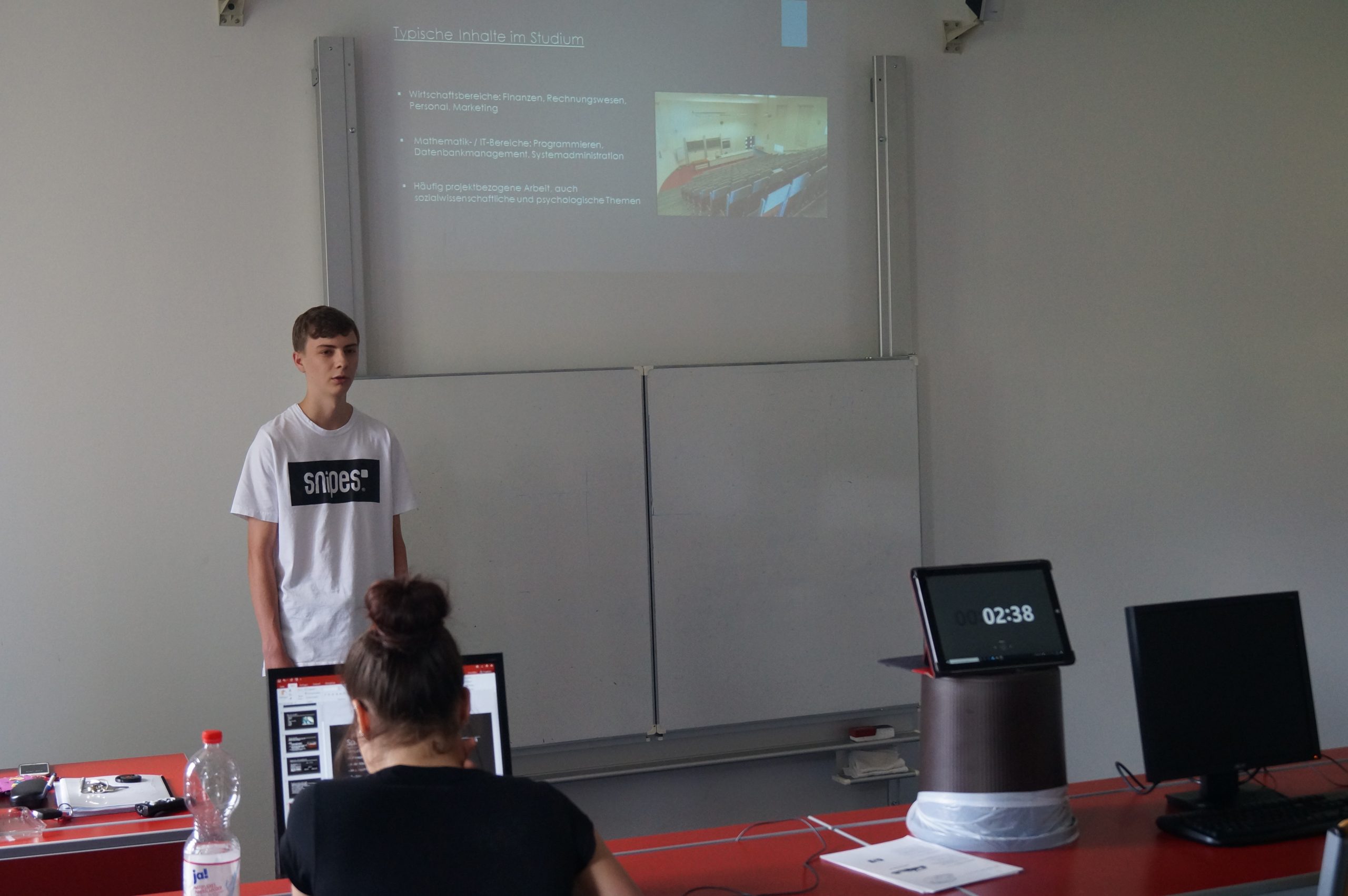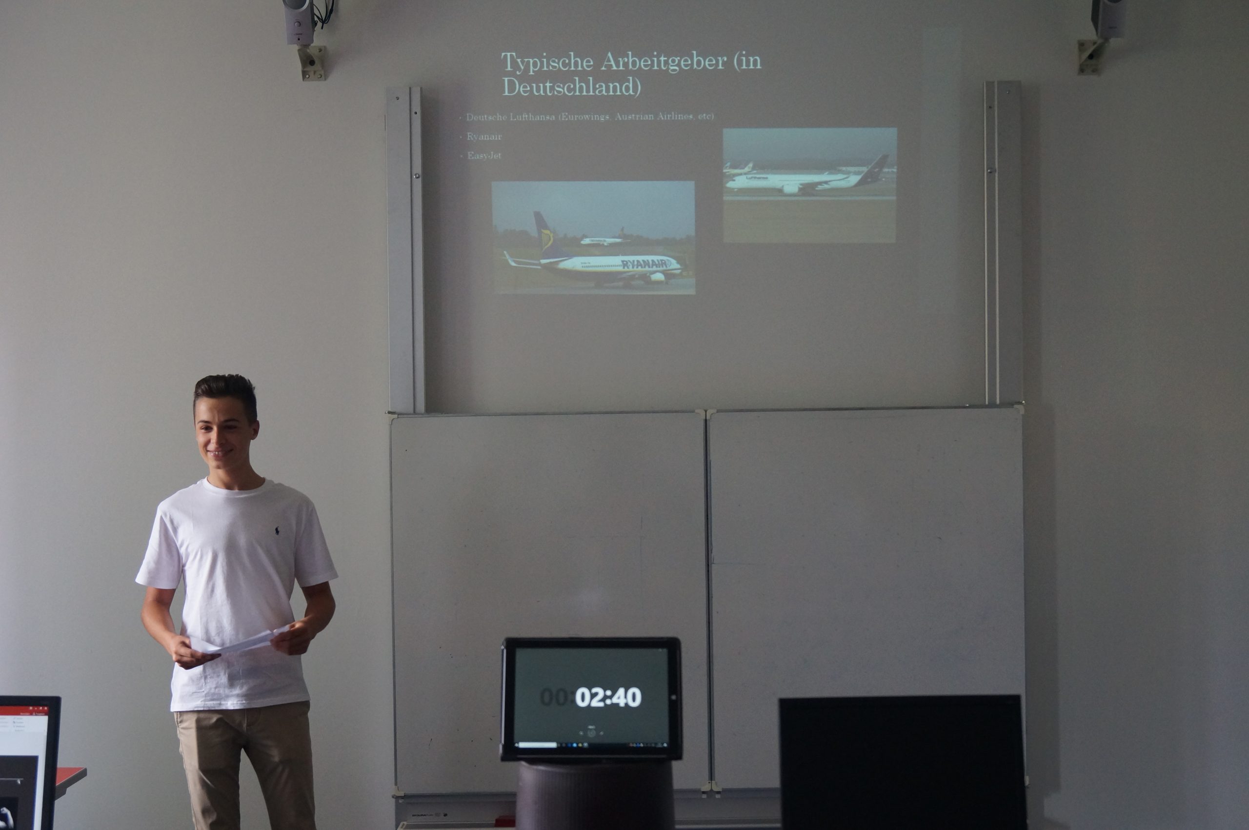 Dann begann der Pecha-Kucha-Vormittag: Jeder Schüler wurde über 13 andere Studiengänge und Ausbildungsberufe informiert. Wer seinen Vortrag gehalten hatte, steuerte am Lehrerrechner die Präsentation seines Nachfolgers, indem er alle 30 Sekunden zur nächsten Folie weitersprang – unabhängig davon, ob sie schon fertig besprochen war. In mehreren Fällen hätte man gerne mehr über das Thema erfahren, doch nach exakt 3 Minuten wurde der Vortragende durch den für ihn selbst nicht sichtbaren Timer unterbrochen.