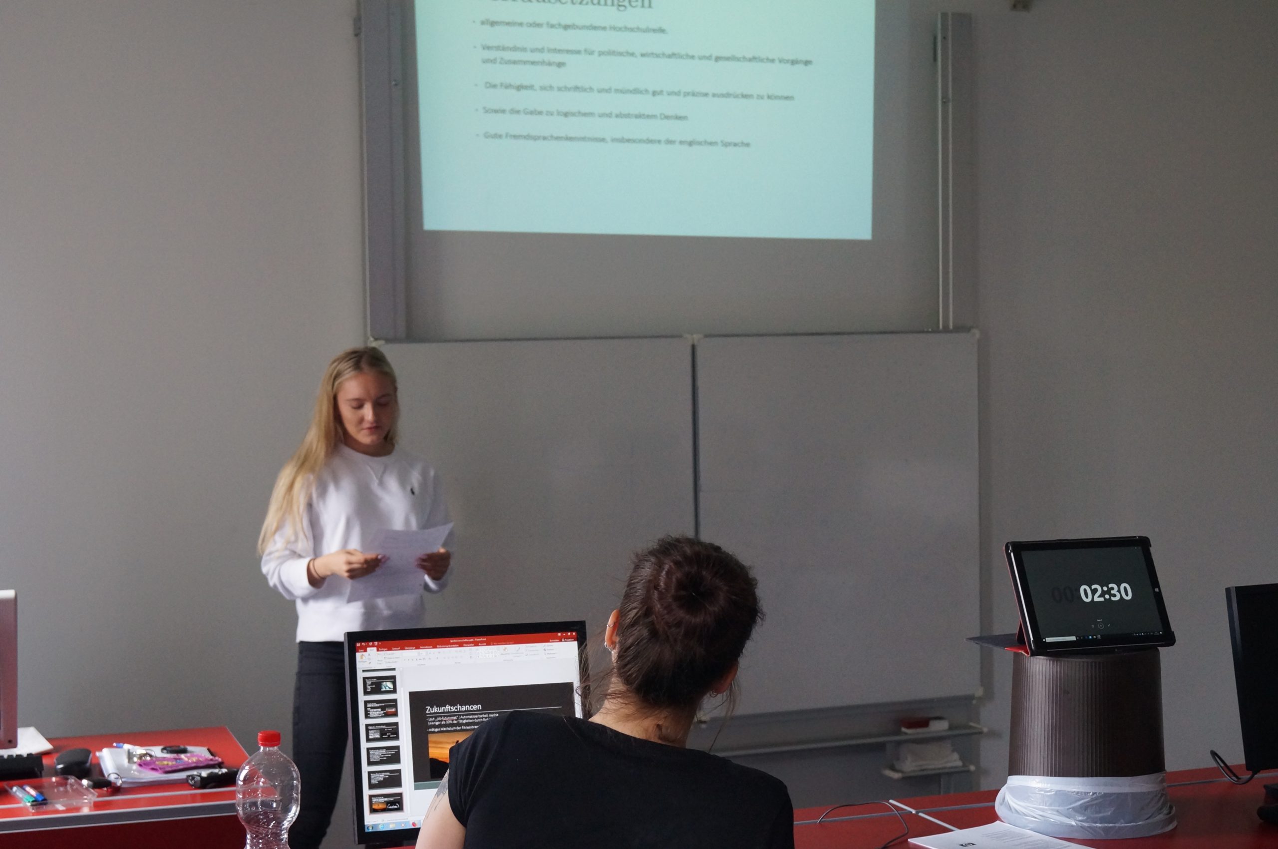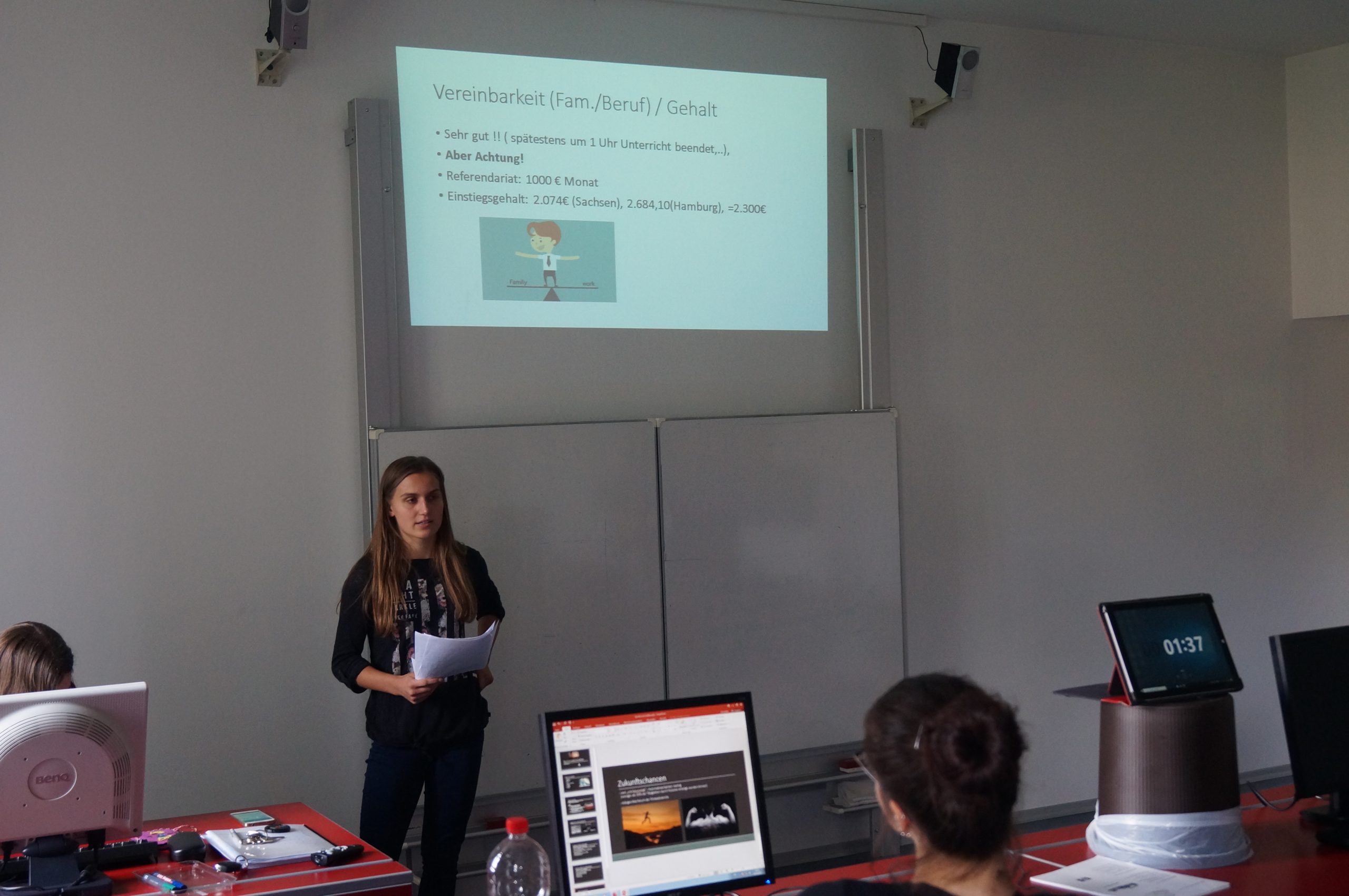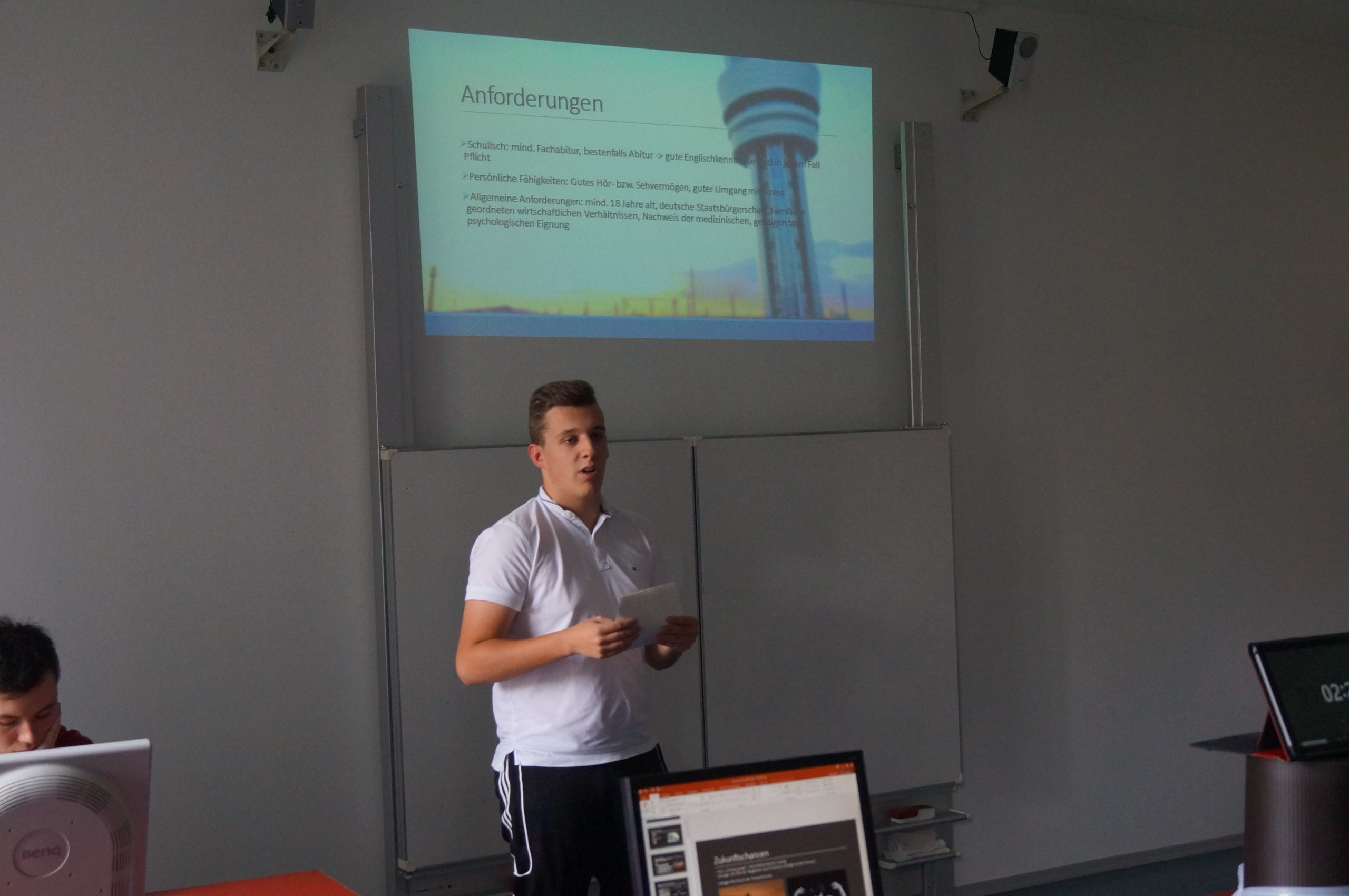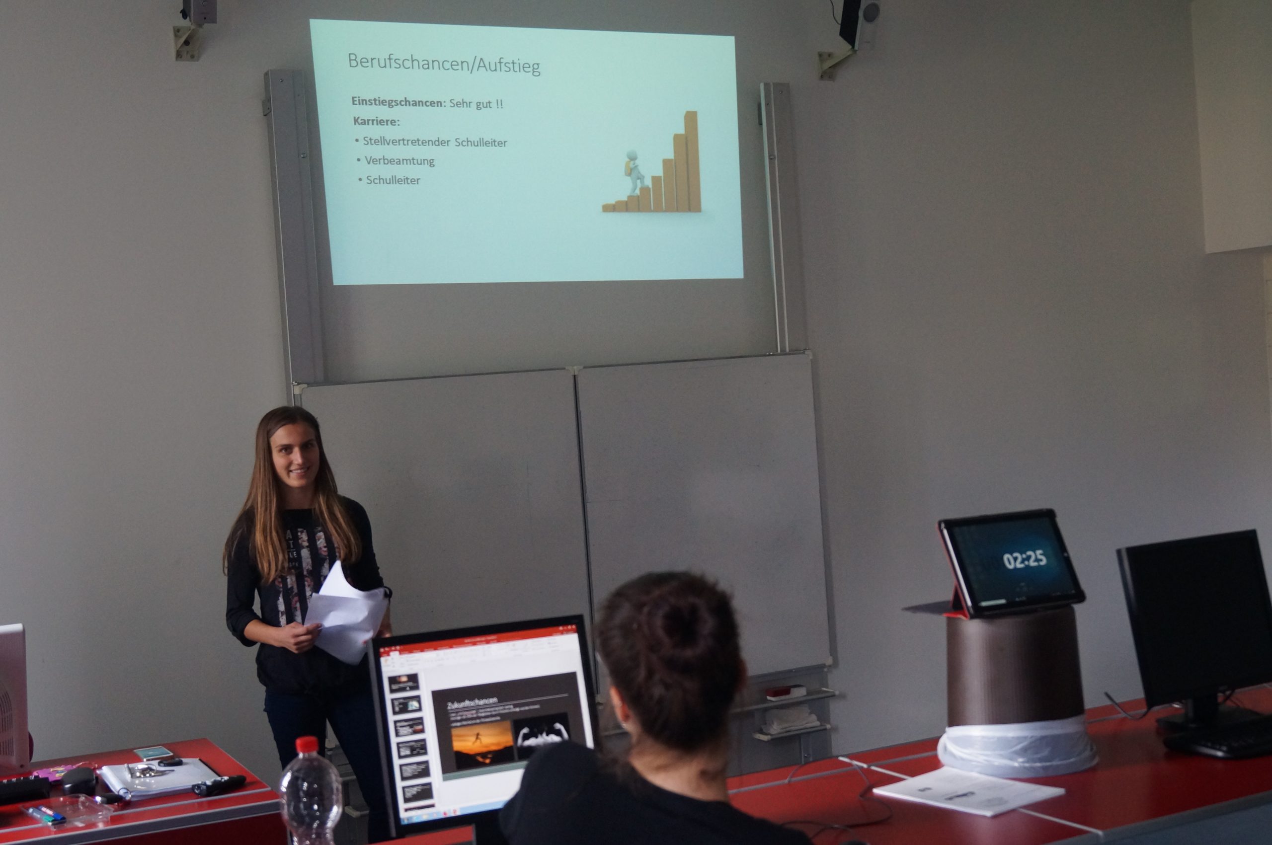 Dann begann der Pecha-Kucha-Vormittag: Jeder Schüler wurde über 13 andere Studiengänge und Ausbildungsberufe informiert. Wer seinen Vortrag gehalten hatte, steuerte am Lehrerrechner die Präsentation seines Nachfolgers, indem er alle 30 Sekunden zur nächsten Folie weitersprang – unabhängig davon, ob sie schon fertig besprochen war. In mehreren Fällen hätte man gerne mehr über das Thema erfahren, doch nach exakt 3 Minuten wurde der Vortragende durch den für ihn selbst nicht sichtbaren Timer unterbrochen.