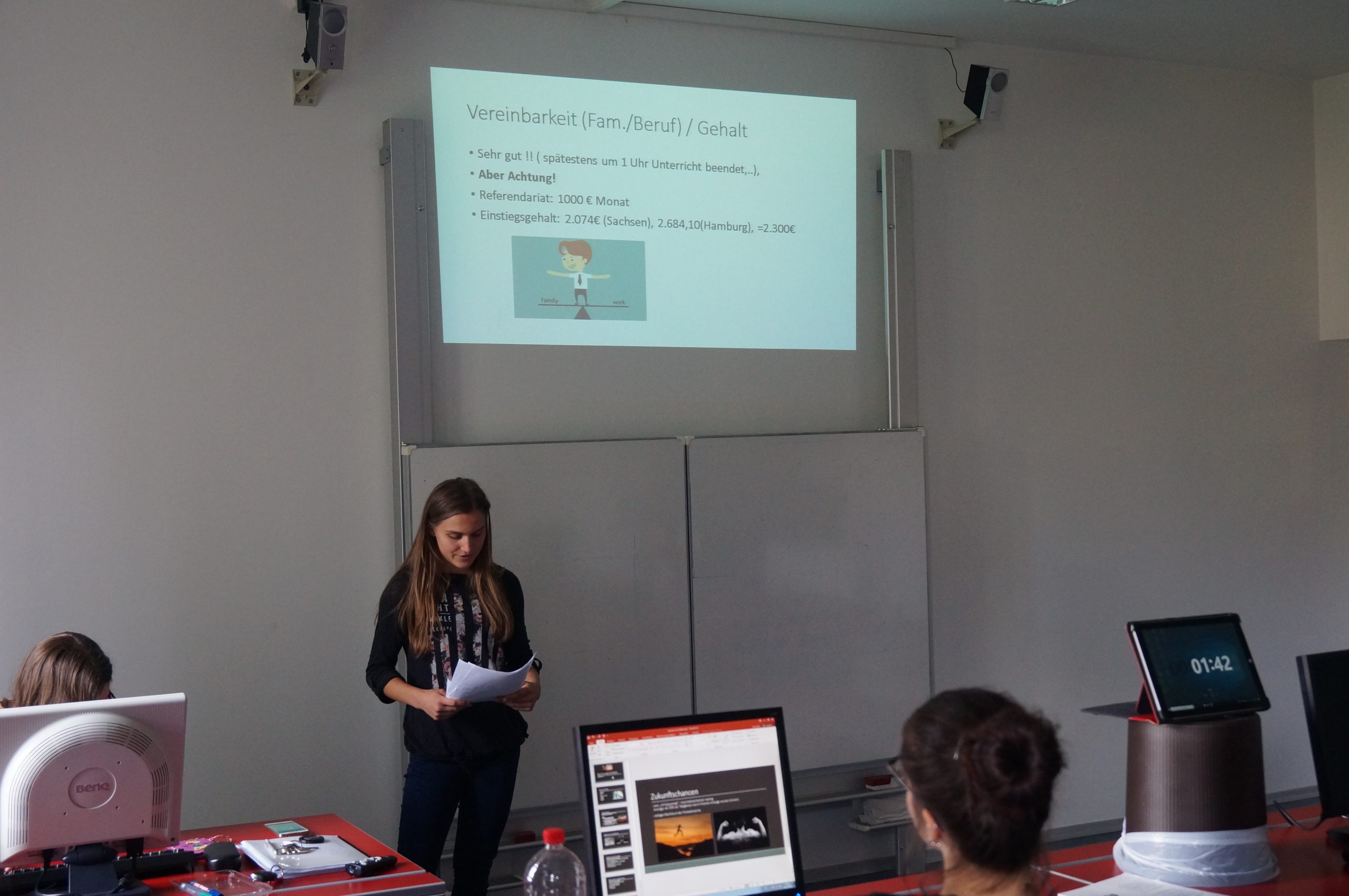 In unserer fachpraktischen Anleitung schränkte ich weiter ein: Jeder Schüler darf maximal sechs Folien jeweils 30 Sekunden besprechen. Somit hat jeder Schüler maximal 3 Minuten Zeit, um die Mitschüler von seinem Ausbildungsberuf/Studiengang zu überzeugen. 14 Schüler sind damit in etwas mehr ale einer Stunde durch (plus jeweils ca. 1 Minute für den Wechsel des Referenten und der Präsentation).