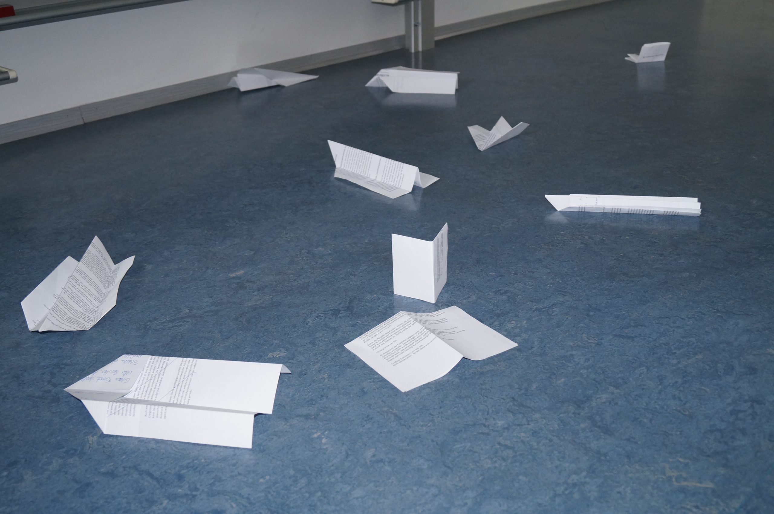 Im Anschluss an den letzten Vortrag habe ich die Schüler um ihr Feedback zu diesem Vormittag gebeten: Mögliche Inhalte: Wie fanden Sie diesen Vormittag? Fiel es Ihnen leicht, sich in Ihren Beruf/Studiengang einzuarbeiten? Wie finden Sie die Vortragstechnik Pecha Kucha? Bereiteten die Zeitvorgaben (6 * 30 Sekunden) Ihnen Stress? Die Schüler schrieben ihr Feedback auf DINA4-Papier, das sie anschließend zu Papierfliegern gefaltet nach vorne Richtung Lehrerpult warfen. Die angekommenen Flieger wurden von mir aufgeklappt und (unzensiert) vorgelesen. Die Rückmeldung durch die Schüler freute mich, denn sie fiel überwiegend positiv aus und zeigte, dass auch die Schüler diesen Vormittag gewinnbringend empfanden.