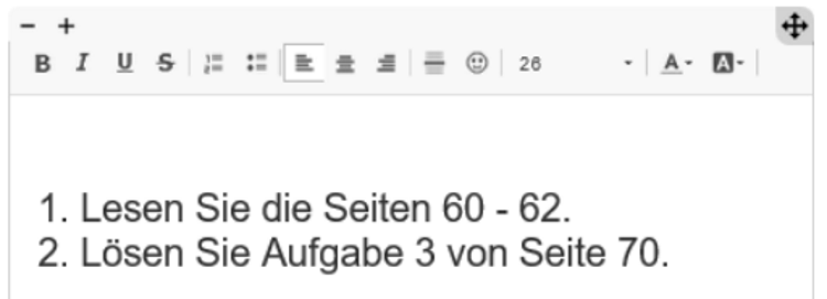 Über das Widget „Text“ steht Ihnen ein einfacher Texteditor zur Verfügung, in den Sie z.B. Arbeitsaufträge oder Lösungen eingeben können. Oder Sie nutzen den Editor z. B. für Brainstormings. Sie können zwei Textfenster gleichzeitig benutzen.